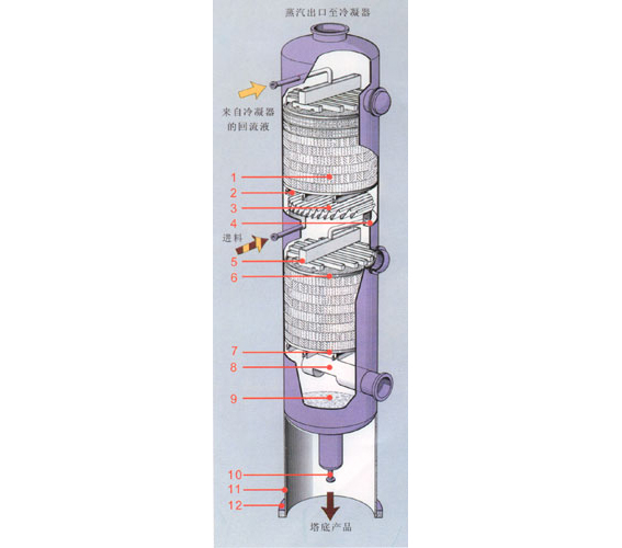 1、規(guī)整填料2、支撐柵板3、液體收集器4、降液管5、管式液體分布器此結(jié)構(gòu)適合于直徑小于800mm的填料塔。